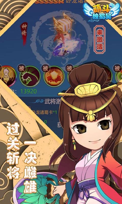 萌斗魏蜀吴是一款以三国为主题,结合中国传统神话故事创作的挂机类回合手游,在游戏中玩家将扮演一名主公,收服武将,培养上古神兽,攻城略地,制霸神话三国世界,喜欢这类游戏的朋友们赶快来下载体验吧!